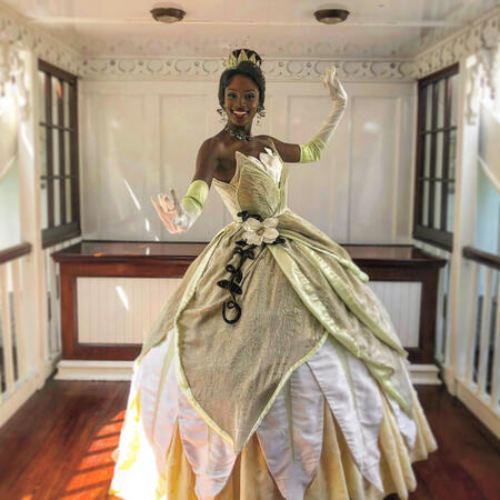 you hold princess tiana's hands while shane and ryan pose with cinderella and princess aurora. you tell princess tiana that you like her crown a lot and she thanks you